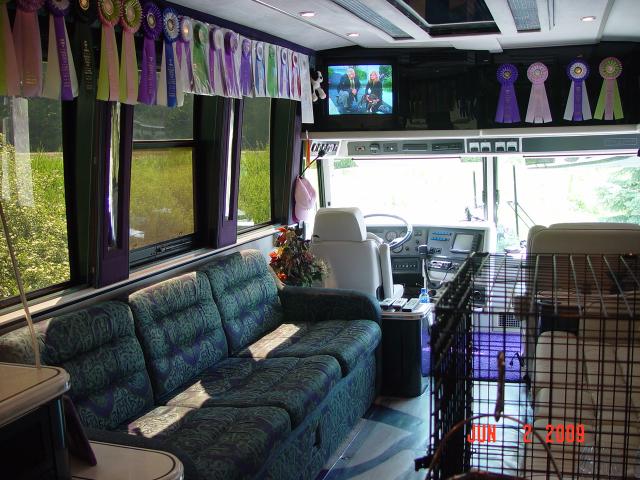 Here you can see through the first crate into the one beside it. These 2 crates were for Jenny, Belle and Bonnie. You can see we installed 2 small lights and 2 small fans to keep air circulating. We always had 1 male and 1 female Doberman loose with us to spraul out on each sofa up front.